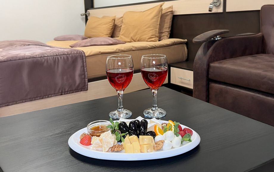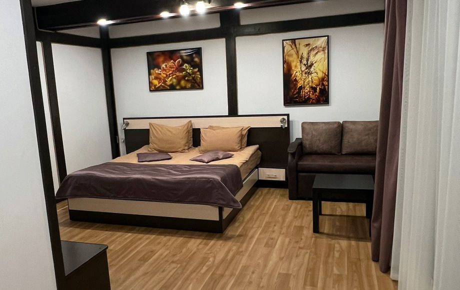 Во всех номерах находятся: двуспальная кровать, раскладное кресло, телевизор, холодильник, кондиционер. Из каждого номера есть выход на просторный балкон со столом и стульями для отдыха.